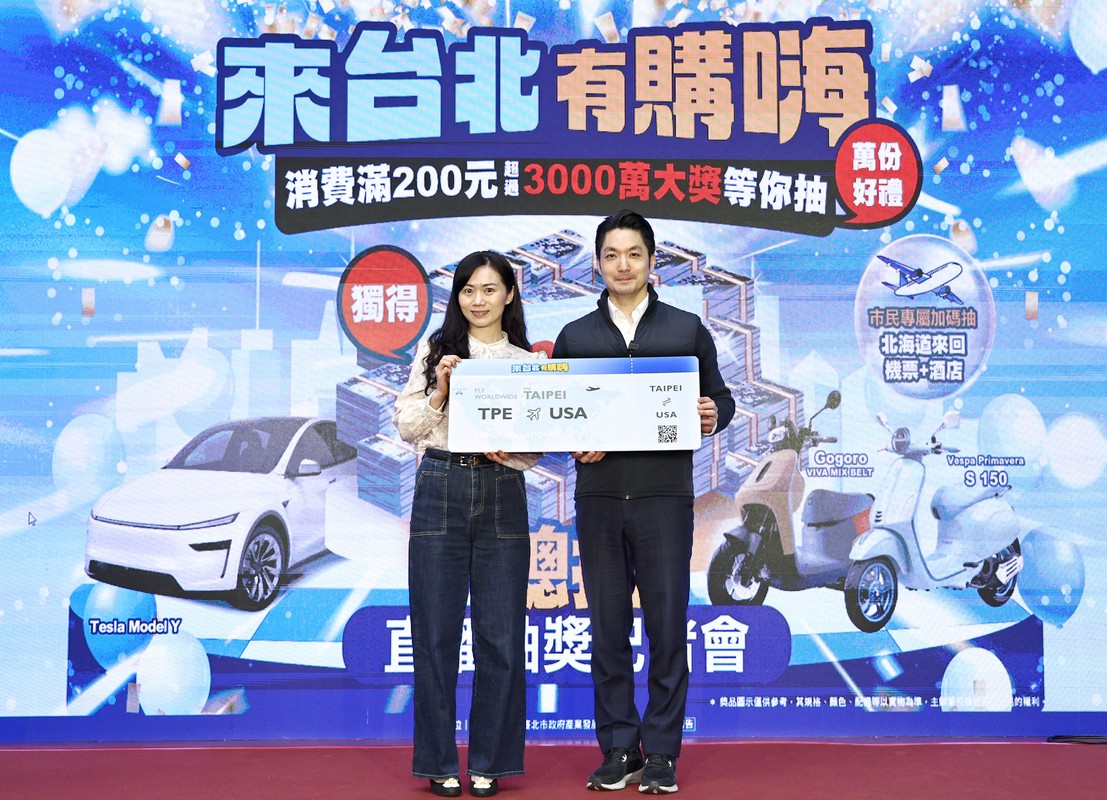 臺北市政府為響應中央普發一萬元政策,順勢推出的「來台北有購嗨 消費歡樂抽」活動,成功將龐大的消費動能留在臺北!活動於今(11)日迎來壓軸總抽記者會,在律師的見證下,由臺北市蔣萬安市長親自揭曉眾所矚目的1,000萬現金、Tesla Model Y等重量級夢幻大獎。不僅如此,臺北市民還有專屬加碼,直接送出北海道雙人機票加酒店,讓您飛往日本享受夢幻假期!現場氣氛嗨到最高點,堪稱今年最具記憶點的幸運時刻。活動期間不僅成功創下突破74億元的消費登錄佳績,更展現了臺北市強大的城市磁吸效應與公私協力成果。