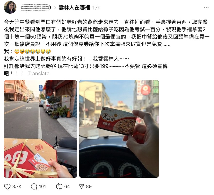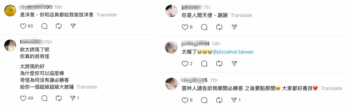 文章曝光後吸引數千名網友點讚,紛紛留言「這洋蔥也加太多了」、「雲林人就是熱情」,更有不少在地人敲碗詢問到底是哪間門市,揚言要用新台幣「下架」這間充滿愛心的必勝客。原PO也感動直呼:「這世界真的有好報,大家快去吃必勝客支持好店!」