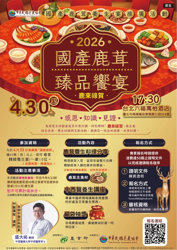 由中華民國養鹿協會主辦、農業部輔導的「2026 國產鹿茸臻品響宴-鹿來祿賀」將於 2026 年 4 月 30 日(四)17:30 在台北六福萬怡酒店隆重舉行。