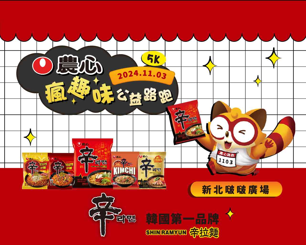 農心辛拉麵推出近40年來,陪伴許多人度過繁忙時刻或宵夜時光,親切形象深植人心,此次5K公益路跑活動更以農心辛拉麵元素和招牌吉祥物浣熊Neoguri作為主題,不僅安排多項互動遊戲、市集攤位,還引進超夯韓式拍貼機,同時推出熱門拉麵品項試吃,邀請大朋友小朋友走出戶外,留下有得吃又有得玩的趣味路跑回憶。即使沒有成功報名到路跑活動,仍可至現場攤位參與精心安排的多項活動,與大家同樂。