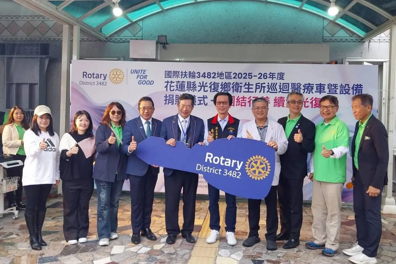 「團結行善 續愛光復」捐贈儀式今(12/5)於花蓮縣光復鄉衛生所舉行。國際扶輪3482地區攜手各社社友與企業代表,捐贈巡迴醫療車、公務摩托車、醫療器材、電腦及辦公設備等物資,協助衛生所加速災後重建,恢復基層醫療能量。ea5354737c0795c