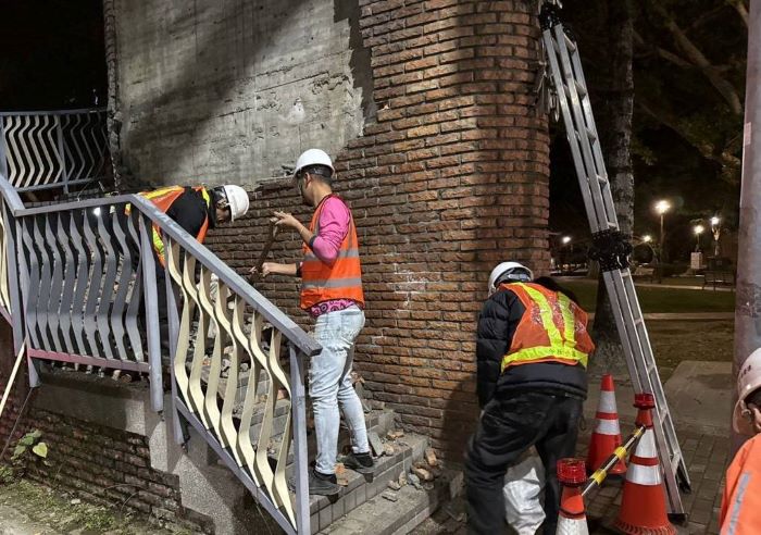 另外,板橋區中山路2段巷弄一處大樓也發生外牆磁磚掉落,工務局迅速會同土木技師公會到場勘查,初步勘查共有部份結構樑柱尚無明顯損傷,後續將要求住戶施作外牆防護措施,以確保用路人的安全。