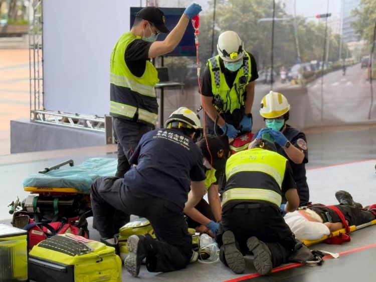 今天活動現場氣氛隆重而溫馨,首先透過OHCA情境演練,完整呈現到院前緊急救護流程,包括119線上指導壓胸(DACPR)、多軌派遣機制(警察運送AED、高階救護支援ALS及Doctor Car)、以及現場啟動院前葉克膜等關鍵措施,具體展現「生命之鏈」從現場急救到院內治療的無縫接軌。