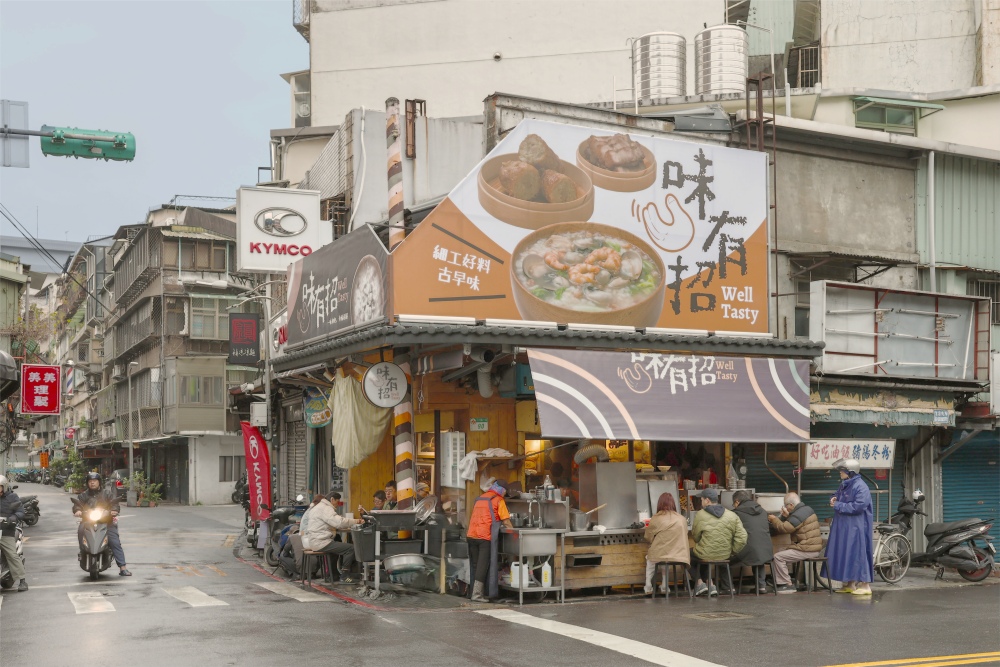 從20多年前的無名鹹粥起家,這碗鹹粥一直是南機場早餐美食的代表之一。數年前交棒給第二代女婿承接,原本無名的鹹粥轉型品牌「味有招」,店面同步改裝,豎起兩副鮮明招牌,包夾著原本矗立在街角的閒置電線桿,宛如從店內拔地穿出。
