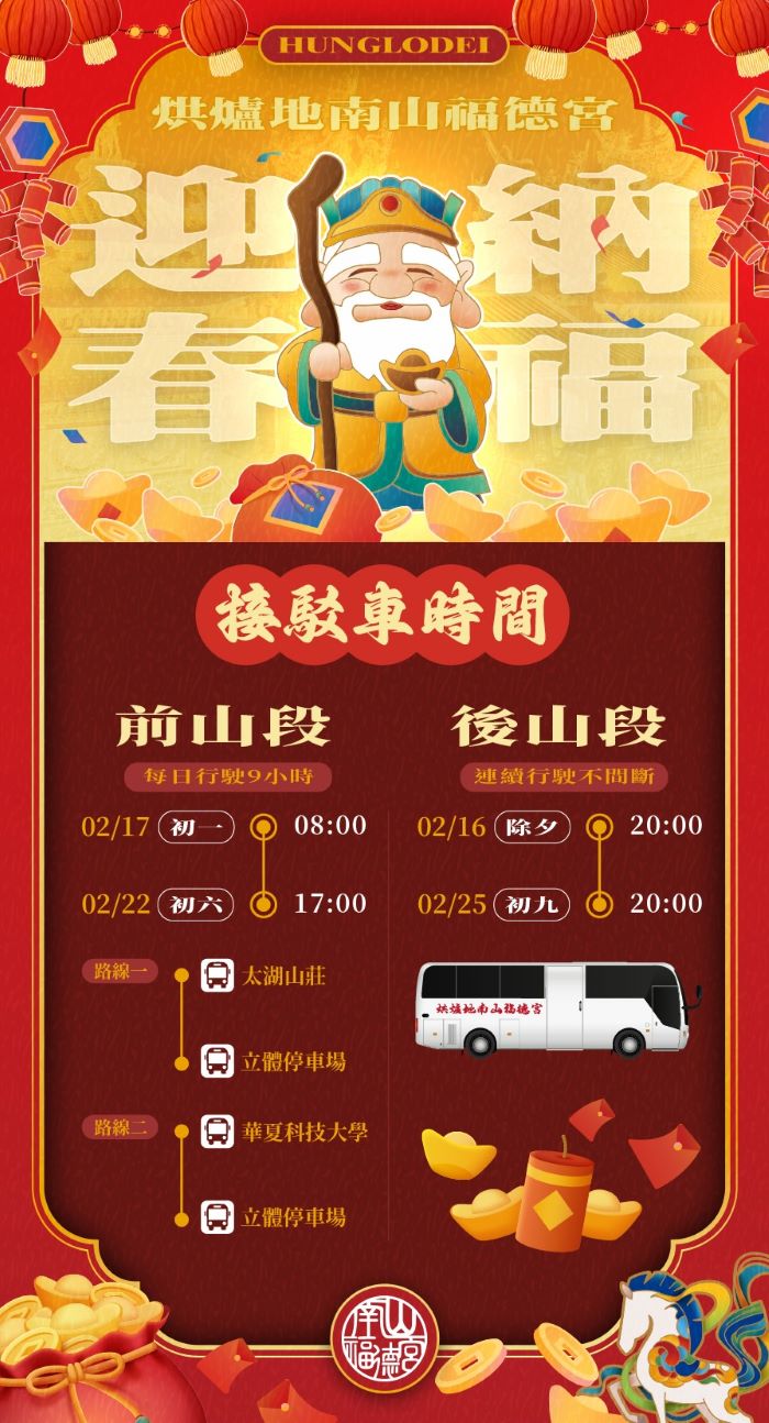 【記者葉柏成/新北報導】農曆過年腳步漸近,春節期間民眾至烘爐地南山福德宮參拜人潮眾多,新北市中和區公所因應南勢地區春節期間疏運措施將自初一至初六(2月17日至22日)實施,為期6天。協調交通局、中和分局及廟方啟動道路交通管制及接駁車等疏運措施。