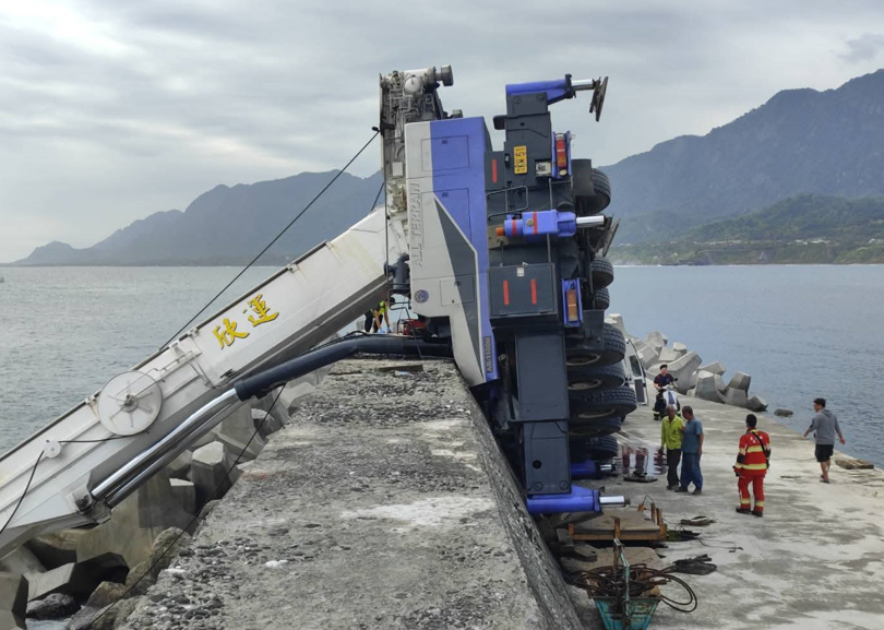 台東縣消防局昨日上午11時24分接獲報案,大型吊車翻覆卡在堤防邊緣,駕駛座嚴重變形,一名作業員意識清楚但遭車體夾住,另一名駕駛(老闆)則受困駕駛座,已無生命徵象。搜救人員立即使用軍刀鋸及三合一破壞剪破壞車體,12時02分成功協助作業員脫困,並由救護車送往台東馬偕醫院救治。事故現場12時04分起火,現場指揮官立即佈署兩條水線滅火,期間因車輛操作油及燃油持續滲漏助長火勢,消防人員緊急抽取海水供水,並改以泡沫覆蓋滅火,14時39分將火勢撲滅。