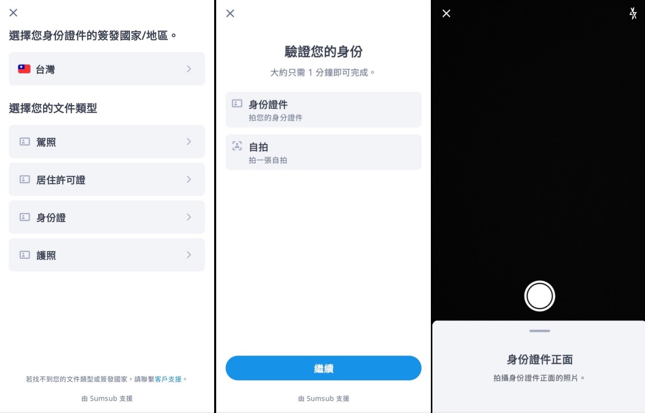 選擇您身分證件的簽發國家/地區與證件類型(以台灣地區為示例),接著為您的證件(正面)拍照並上傳。