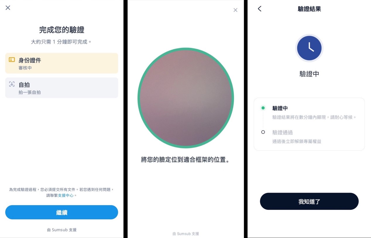 自拍完成後,頁面將顯示「驗證中」。您可點擊「知道了」返回個人帳戶頁面。