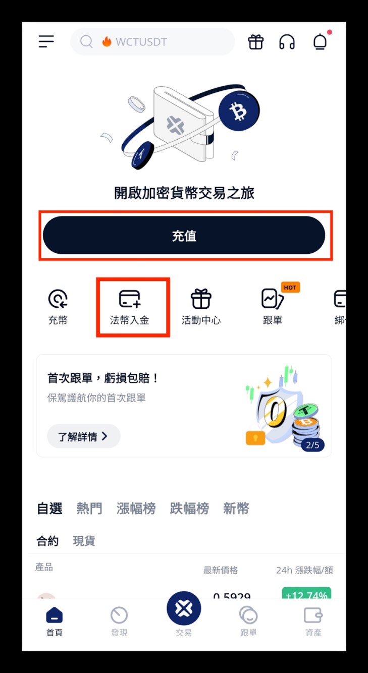 打開 APP 後,可透過以下任一方式進入法幣購買 USDT 頁面:①首頁點擊「充值」或「法幣入金」按鈕;②或在「資產」頁,點擊「充值」,進入「法幣」。