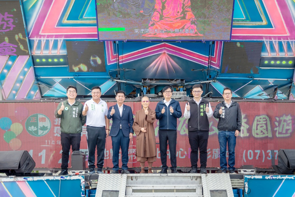 圖▲正德幸福高雄公益園遊會與會貴賓合照,正德社會慈善福利基金會演音法師(右四)、高雄市陳其邁市長(右三)、立委賴瑞隆委員(右二)、立委許智傑委員(左三)、高雄市何權峰議員(右一)、高雄市邱俊憲議員(左一)。(圖/正德慈善基金會提供)