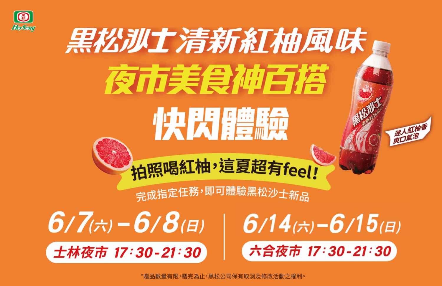 活動期間,只要於士林夜市或六合夜市快閃活動現場拿起手拿牌拍照,並上傳至 Facebook 或 Instagram 限時動態、標註黑松沙士官方帳號,即可現場兌換「黑松沙士清新紅柚風味」一瓶。吃、拍、喝一次滿足,解鎖夜市吃喝「一口解膩、一口爽」的最佳享受!