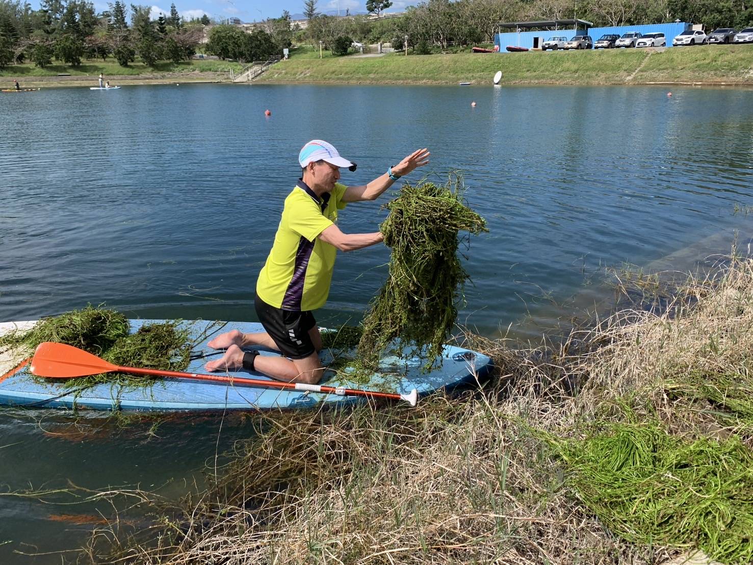 記者池文中/臺東報導 臺東縣水中運動訓練協會理事長黃東益,2日號召約20名會員協助縣府前往活水湖協助清除水草,參與清理工作的水協會員,先在活水湖岸邊做勤前教育,檢查潛水衣、氣瓶及SUP等裝備,團員潛入水中以徒手方式撈起過長水草,並以SUP載運水草至岸邊堆放,清除工作在中午前結束,撈上岸的水草預估2噸。 黃東益表示,活水湖環境天然,水草生長是自然現象,但是生長過盛的水草對民眾體驗水域活動會形成壓力,所以局部拔除矮化。以往也會針對水中外來種魚類如魚虎、泰國鱧等做移除工作,但今天沒有外來魚種,便以矮化水草為主。 農業處指出,活水湖是重要水域環境教育場地,有許多活動及三鐵賽事進行,感謝臺東水中運動訓練協會,以受有專業訓練的人員及裝備,協助清除工作,保障民眾安全。