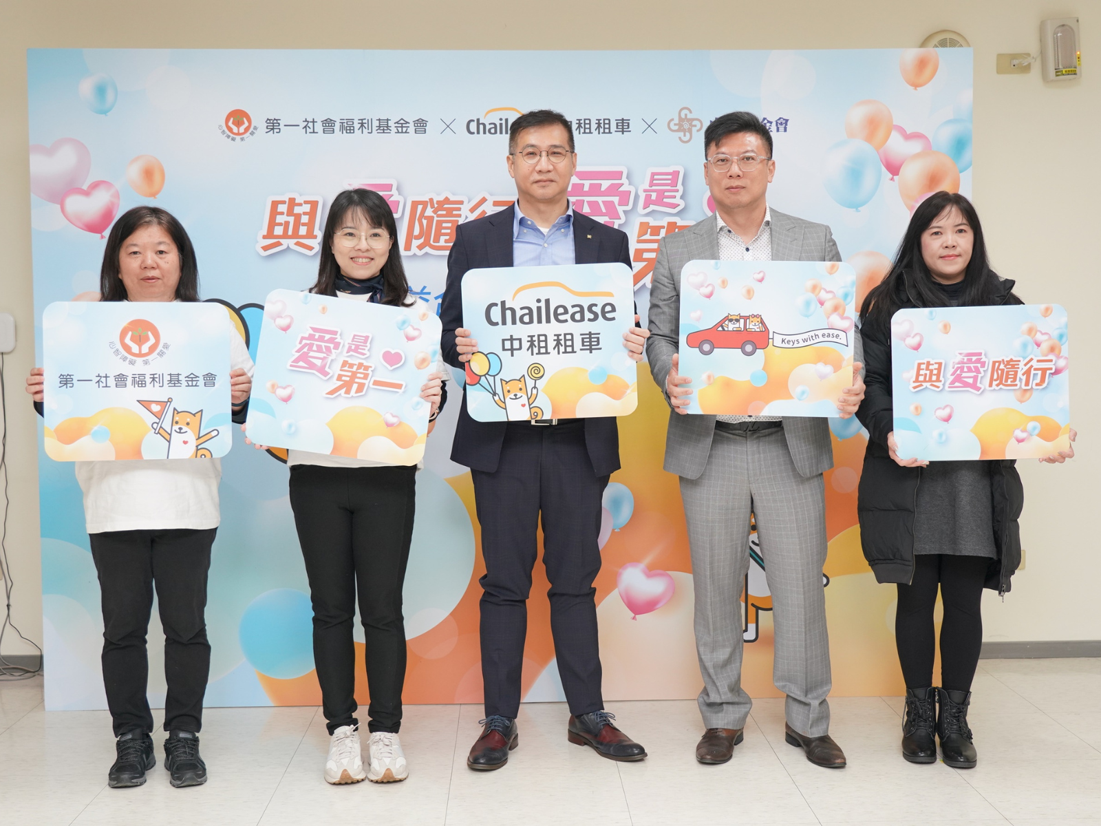 主圖圖說:中租租車副總經理黃元太(中)、中租青年展望基金會秘書長李昆穎(右2)、中租租車經理邱瑋珍(右1)與第一社會福利基金會執行長張菁倫(左2)、第一社會福利基金會副執行長陳淑芬,共同出席活動記者會。