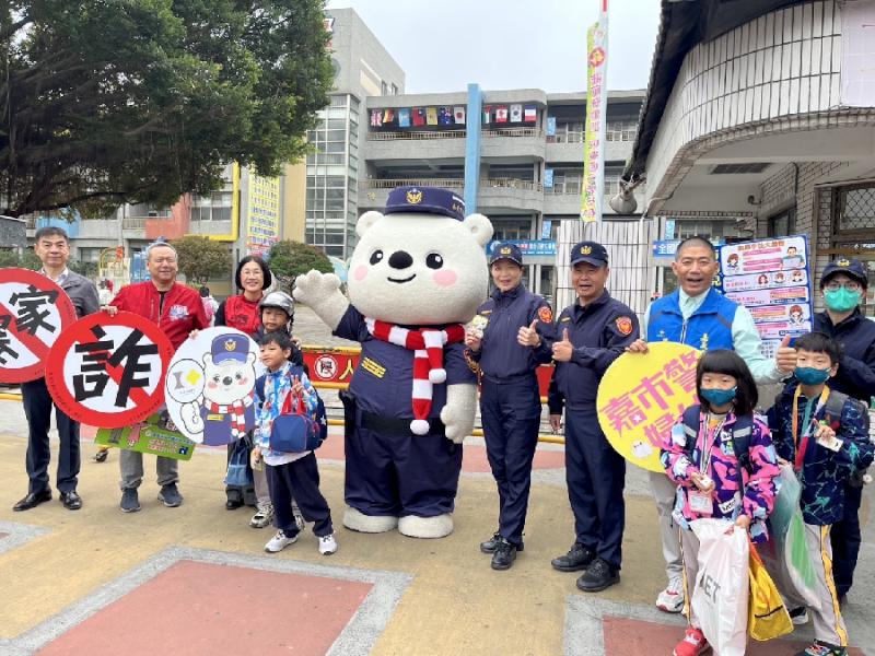 現場除了大白熊和小朋友歡樂互動外,警察局也與嘉義市家長協會合作,一同宣導兒童自我保護及反詐騙的概念,讓開學第一天充滿快樂的氣氛。