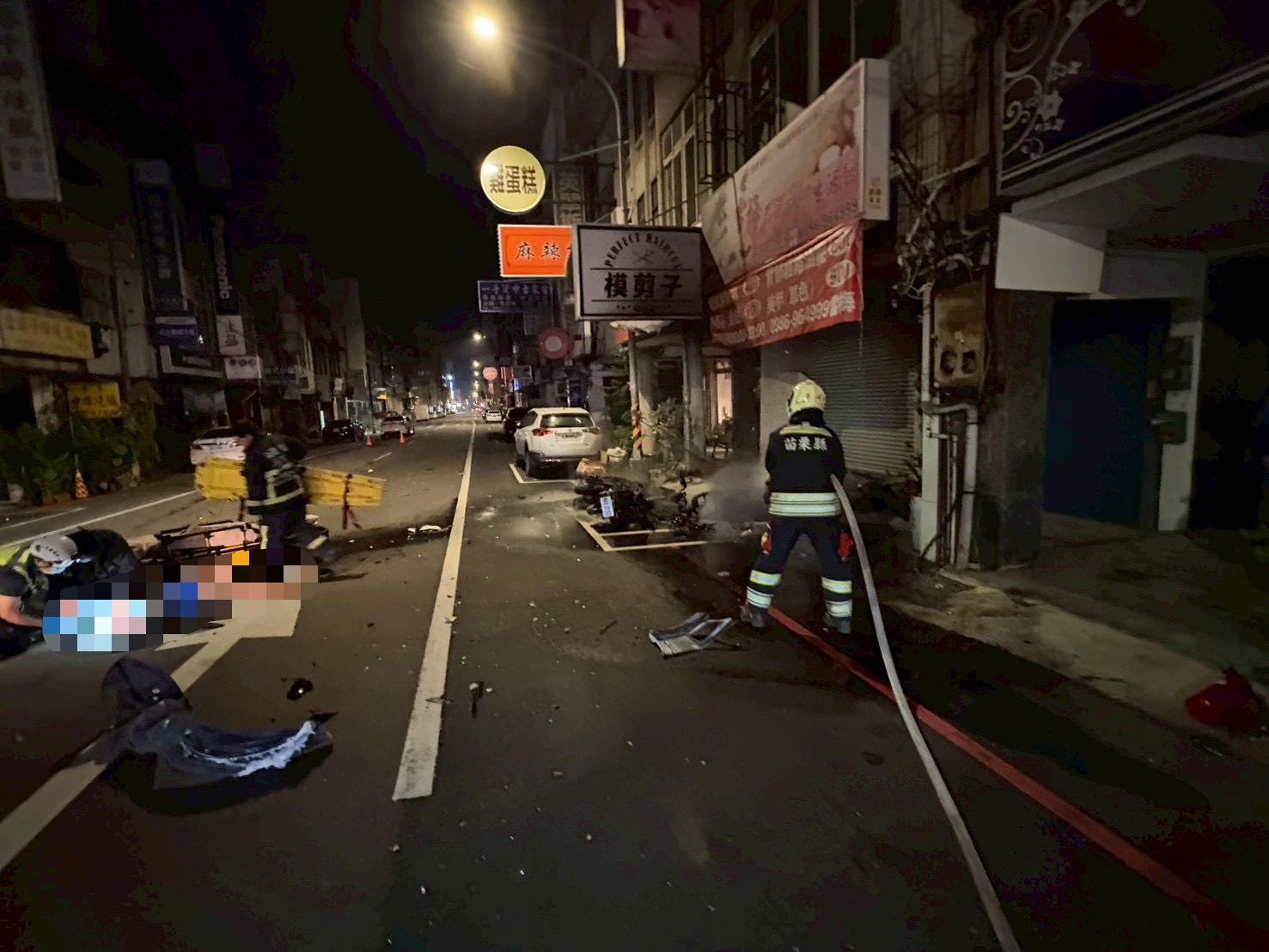 苗栗分局表示,今日凌晨2時許獲報,苗栗市中正路與至公路口8日2時許發生事故,南苗派出所獲報到場後立即協助管制疏導交通。經初步調查,蔡男(19歲)駕駛普重機車由至公路東往西行駛,行經中正路口時,與羅男(22歲)駕駛由中正路南往北直行之自小客車發生碰撞,碰撞後普重機車又滑行碰撞路旁停放之3部普重機車並引發火勢,造成機車駕駛受傷經救護車送醫。