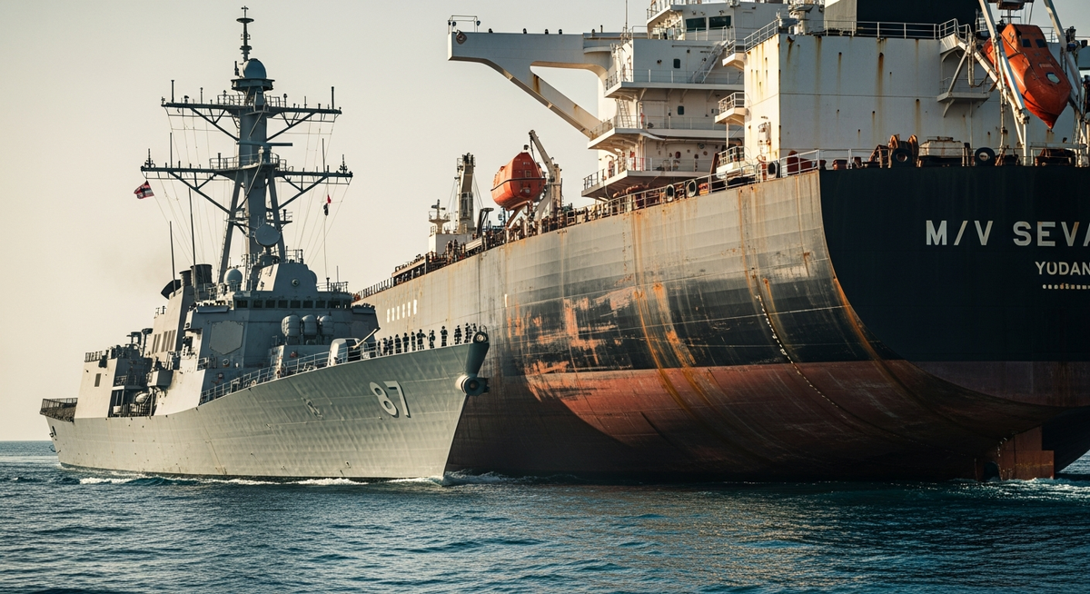 美國海軍上週六在阿拉伯海攔截一艘受制裁的伊朗油輪「M/V Sevan」號,並強制其返航,這是美國針對伊朗「影子船隊」實施海事封鎖行動的一部分。此次行動凸顯中東地區的緊張局勢,並已促使數十艘與伊朗相關的船隻改變航線。
