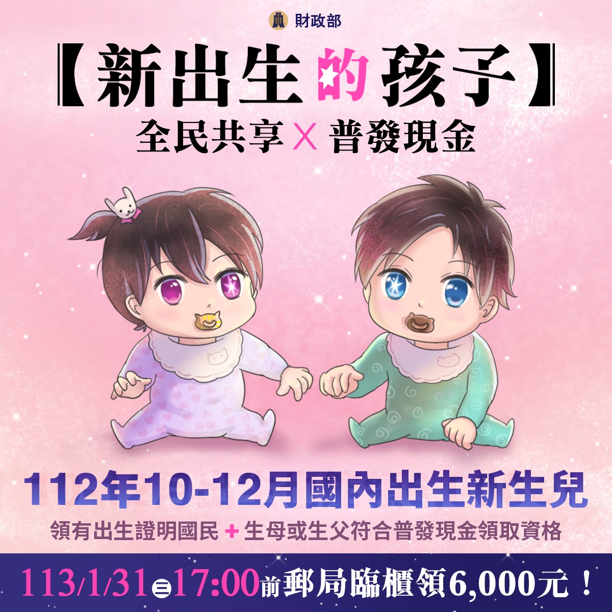 財政部國庫署表示,去年10月至12月在國內出生並領有出生證明,且生母或生父符合資格的新生兒,可領取普發6000元現金,新手爸媽只需備妥身分證明文件及新生兒出生證明,即可在期限內至郵局臨櫃領取。