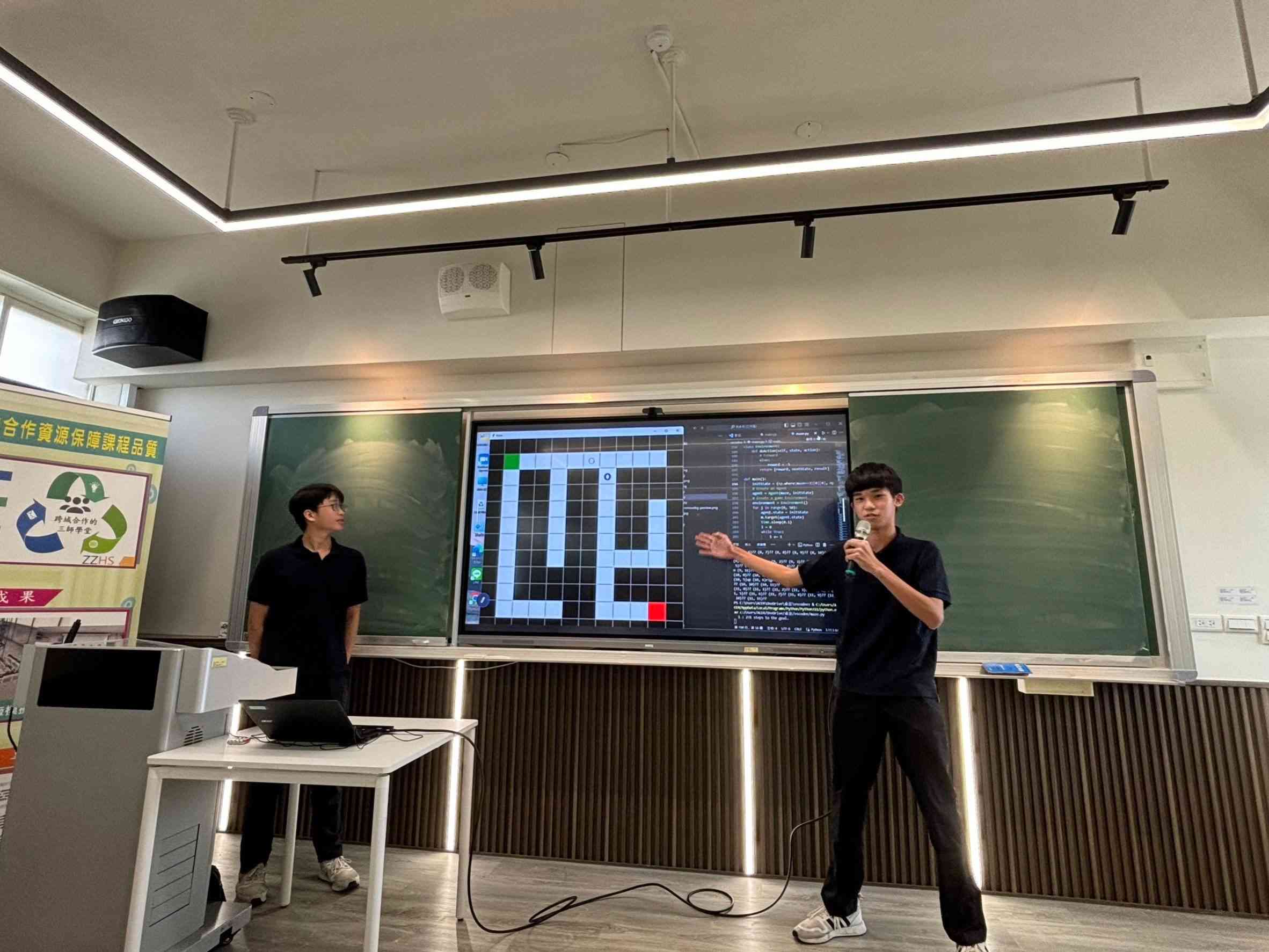 在專題發表迷宮遊戲的學生張瑀哲與羅祥恩說到他們的專題發想來自於遊戲的玩樂經驗,他們花了一年的時間奠定基礎,像是訓練邏輯、教導基本的程式語言、認識AI等等,到了高二,開始實作專題,在課後的時間研究以及製作,他們運用了QLearning強化學習使角色能夠在迷宮裡能夠自行走路尋找終點,並設計關卡進行懲罰與獎勵,加速訓練AI玩家,利用二叉樹演算法製作隨機迷宮的生成,讓每次角色訓練的地圖不一樣。