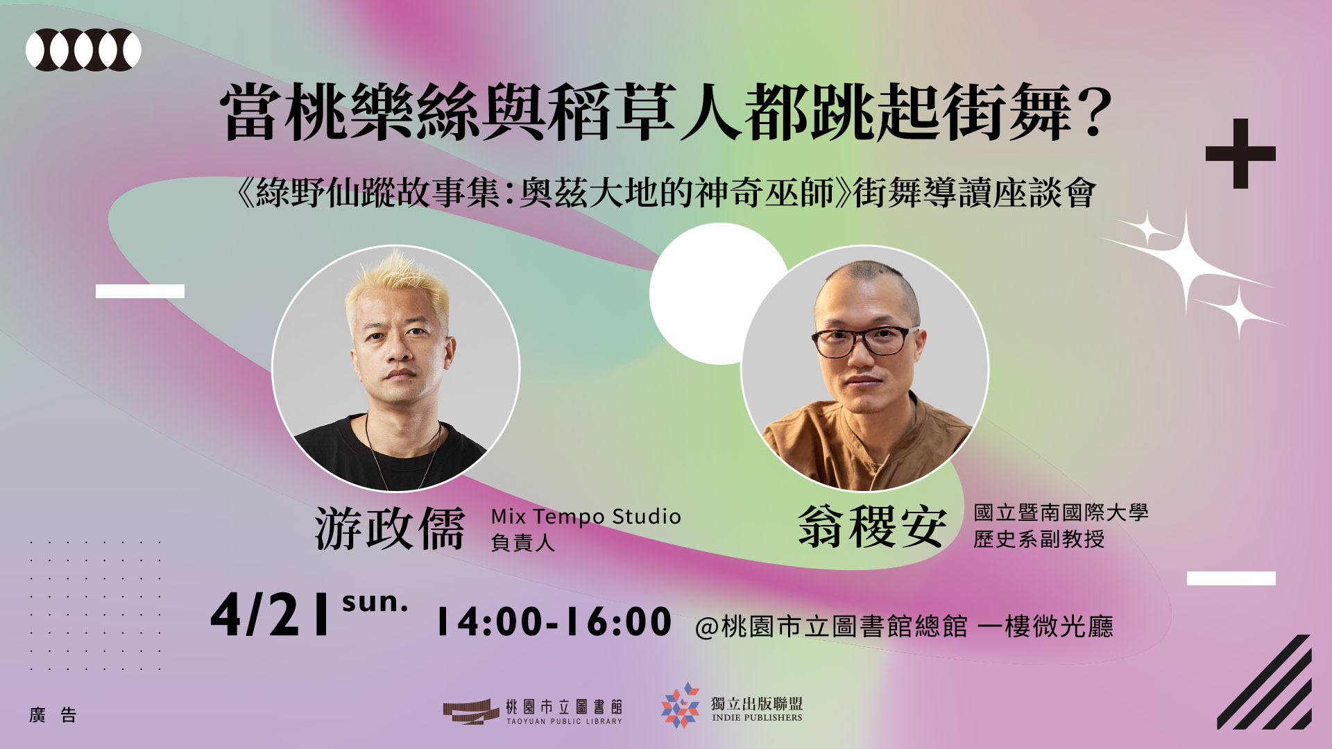 親子共舞後,臺灣街舞藝術協會理事長、Mix Tempo舞團團長,街舞圈人稱小P的游政儒,將與國立暨南國際大學歷史系副教授翁稷安,一起帶著大家從不一樣的角度來讀「綠野仙蹤」。