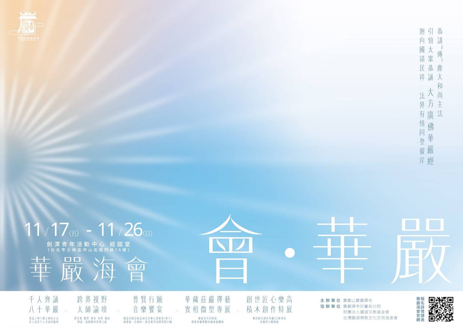 由寶嚴山寶嚴禪寺籌辦,融合了藝術、音樂、兒童教育與人文議題的殊勝華嚴盛會,即將在11月17日至26日首次在台北市「劍潭青年活動中心」盛大舉行。此次盛會將聚集來自全球各地華人、僧俗四眾上千人,謹懷虔心深入經藏,共誦一整部《大方廣佛華嚴經》,拉開為期十天的「華嚴海會」之序幕。