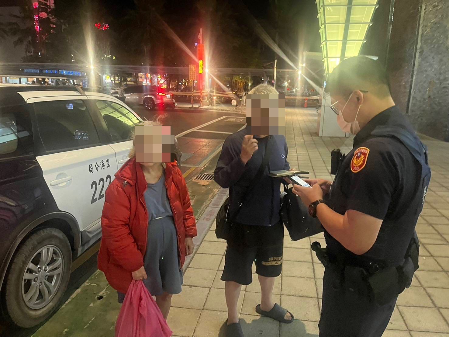 屏東縣里港警分局大平派出所於凌晨2時許接獲報案,得知轄區永豐路2段有一名長者迷路需協助。警員曾艷秋、黃雍程立即趕赴現場,發現一名阿嬤獨自在道路上行走,即刻攙扶至路旁,避免發生危險,並關心其狀況。