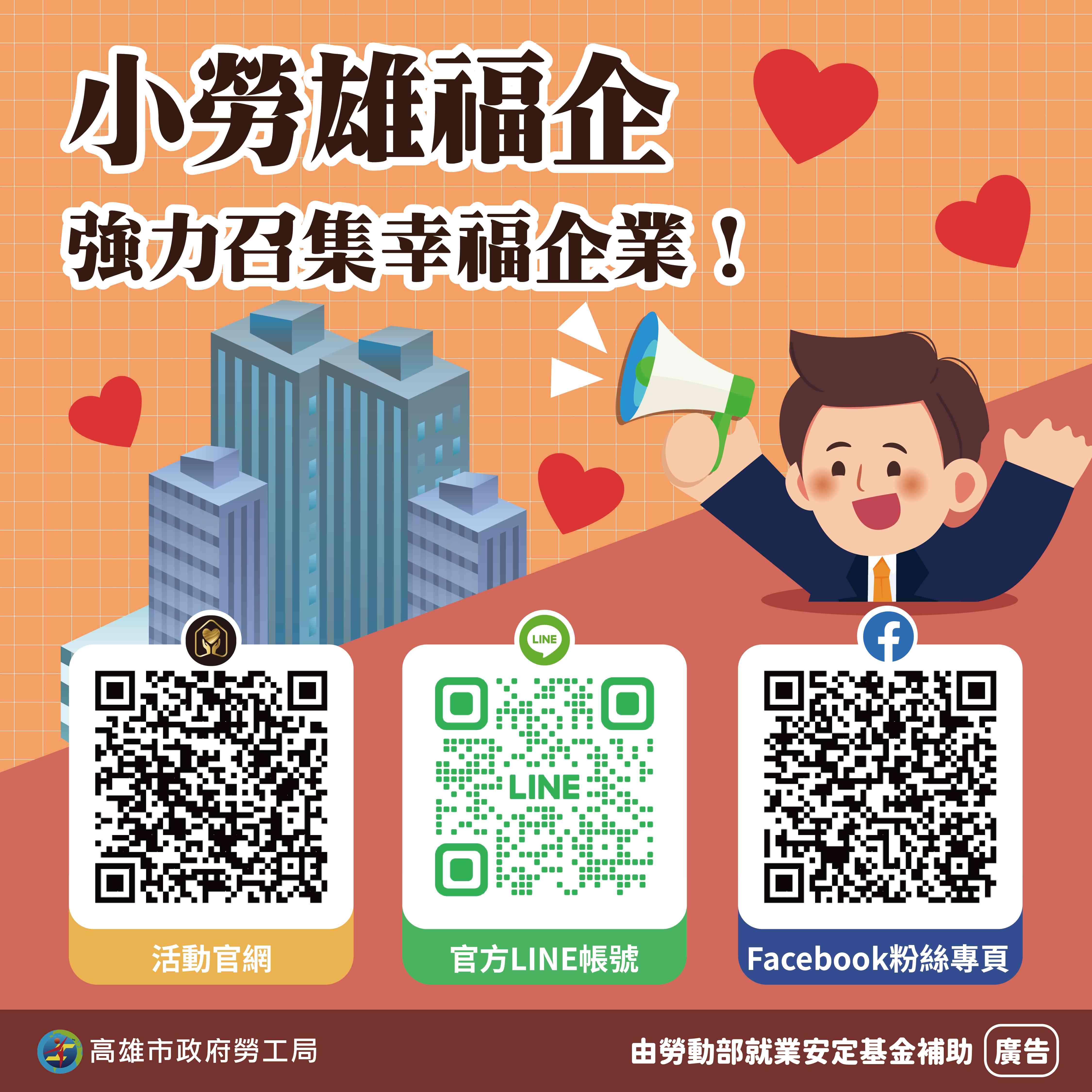 「小勞雄福企 溫暖心城市」幸福企業評選回來啦!高市勞工局舉辦幸福企業評選,表揚給予勞工朋友良好工作條件的事業單位,期望提升事業單位對職場勞動條件的重視,讓高雄成為擁有優質就業環境的幸福城市。活動於即日起至8月16日於活動官網受理報名及推薦,評選組別分為A組(僱用員工人數:100人以上)、B組(僱用員工人數:30人~99人)和C組(僱用員工人數:1人~29人)事業單位,更多詳細資訊可洽勞工局網站了解。