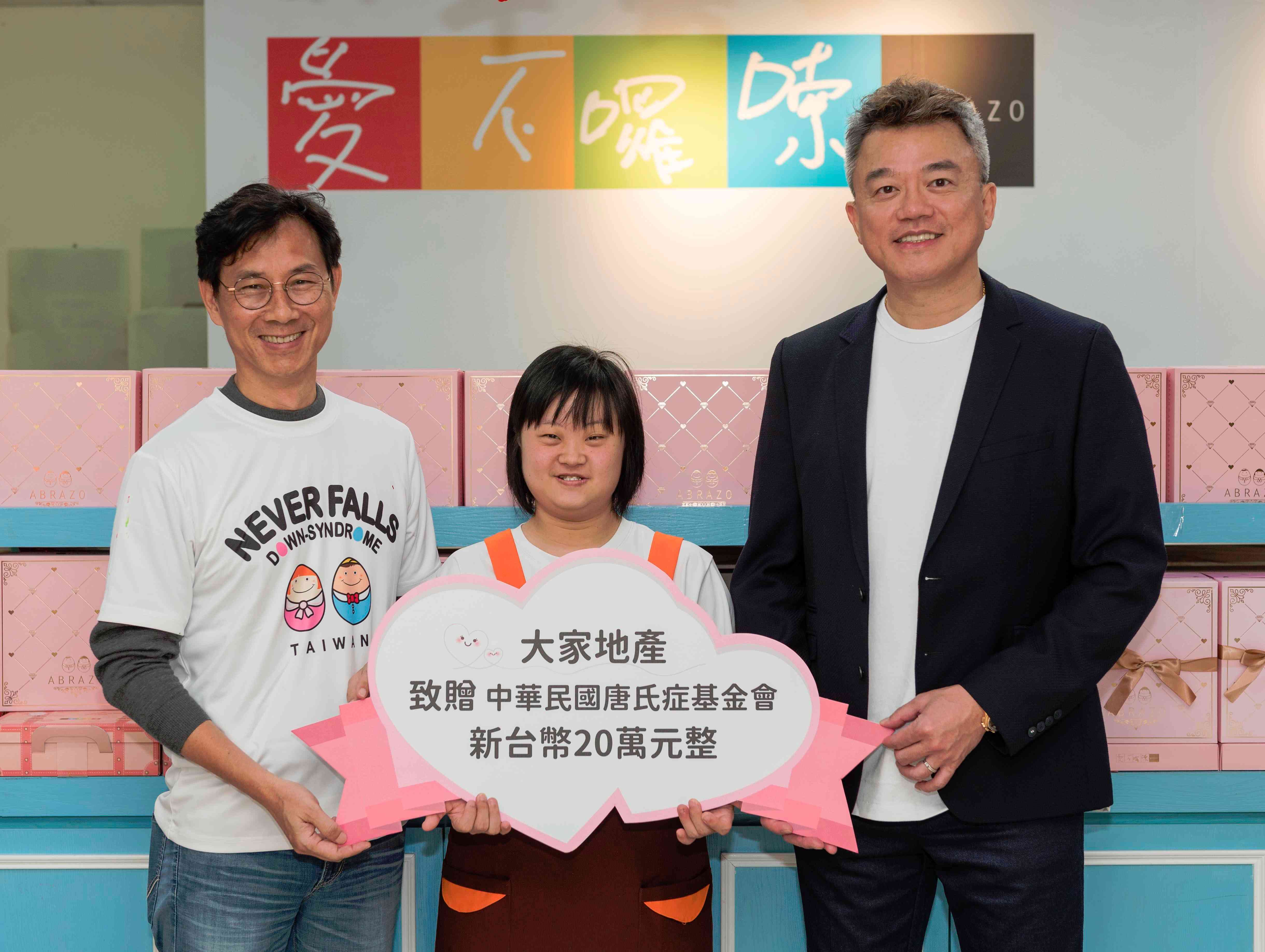 大家地產投身公益,卓家雄董事長與唐寶寶合影,支持「愛不囉嗦」禮盒(圖為唐氏症基金會林正俠董事長)圖片來源:大家地產提供