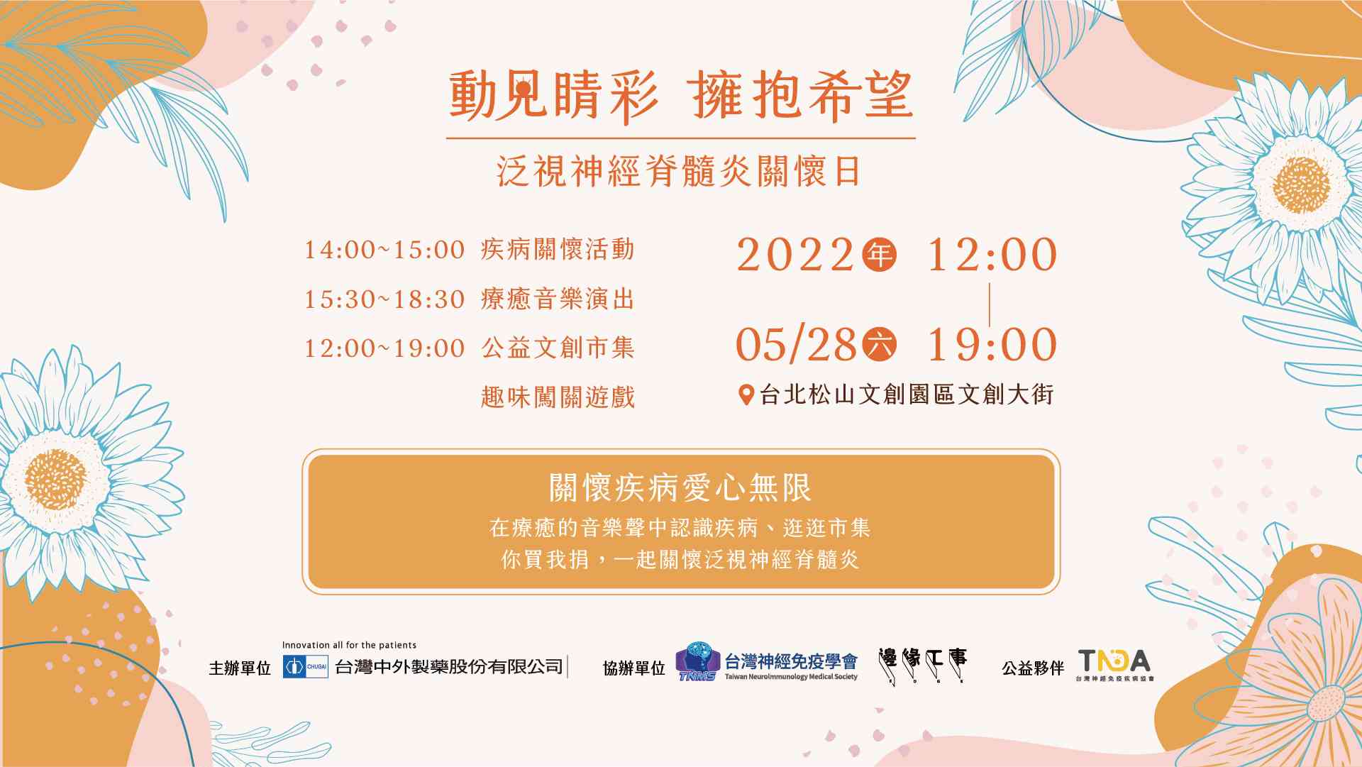 長期致力關懷泛視神經脊髓炎病友的台灣中外製藥,有鑒於病友們飽受疾病的壓力,並希望能讓更多人認識『泛視神經脊髓炎』。五月在希臘神話中,為掌管豐富生命女神的月份,因此今(2022)年在充滿愛與關懷的五月,首次與台灣神經免疫醫學會及知名的邊緣人市集合作,將於5月28日(六)『泛視神經脊髓炎關懷日』當天,於台北松山文創園區舉辦「動見睛彩 擁抱希望」活動,希望能透過活動,讓更多病友重拾生命的精彩,也邀請民眾一起來發揮愛心。