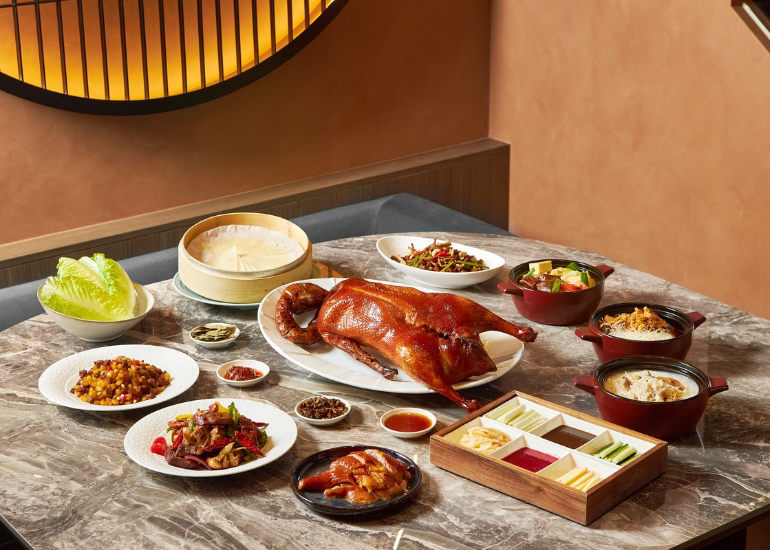 在料理方面,由擁有近20年資歷的主廚林韋甫掌舵,其過去歷練橫跨大三元酒樓與台北新板希爾頓酒店等知名餐飲體系,擅長在傳統粵菜基礎上融入細膩現代手法。招牌爐烤片皮鵝為主打菜色之一,選用雲林白羅曼鵝種,經醃製與火候控制後呈現外皮酥脆、肉質多汁的口感。現場亦安排專人桌邊片鵝服務,從刀工到擺盤皆具觀賞性,強化整體用餐儀式感。