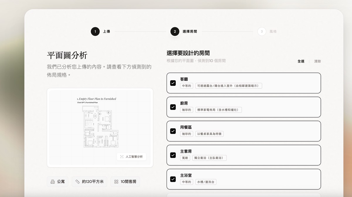根據實測,使用者只需上傳一張「平面圖(Floor Plan)」,系統即會啟動AI引擎,自動完成以下流程: