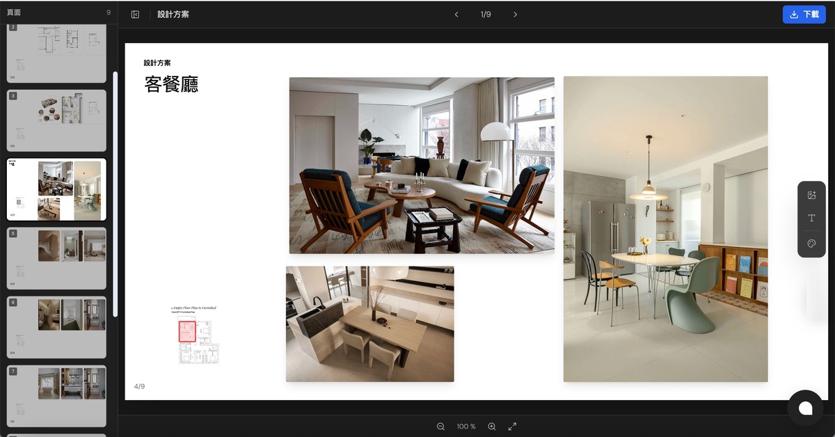 AI會自動將平面圖區域與對應風格參考圖進行版面配置,並可透過AI進行圖片調整與優化,快速輸出一份完整的提案簡報。