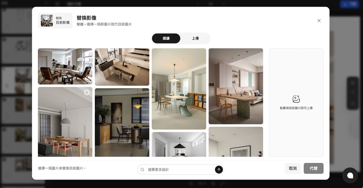 設計師可在系統生成的初版簡報中,透過「關鍵字搜尋」(如:弧形天花板、隱藏燈帶)即時替換參考圖片,或從圖庫中獲得更多靈感建議,甚至可直接透過AI微調圖片呈現結果。